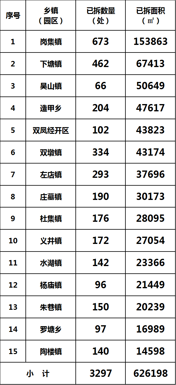 根據(jù)市委、市政府統(tǒng)一部署和《合肥市違法建設(shè)治理專項(xiàng)行動(dòng)實(shí)施意見(jiàn)》相關(guān)要求,現(xiàn)將全市違法建設(shè)治理專項(xiàng)行動(dòng)進(jìn)度情況通報(bào)如下: (13個(gè)鎮(zhèn)街園,已拆除2288070㎡)