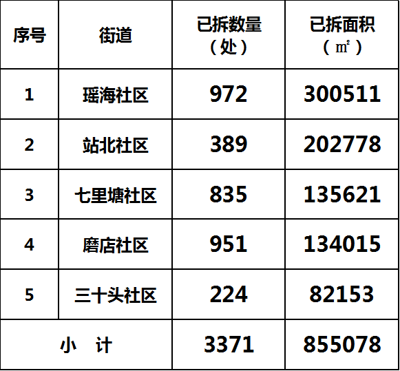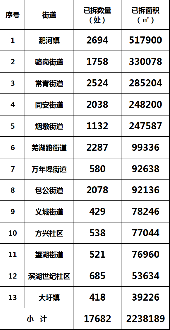 (12個(gè)鎮(zhèn)街園,已拆除2234396㎡) 表五:包河區(qū)各街道違法建設(shè)治理專項(xiàng)行動(dòng)工作進(jìn)度表 (13個(gè)鎮(zhèn)街園,已拆除2238189㎡)