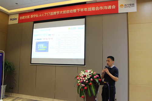 緊接著,合肥市區蘇寧經營體體長劉金柱現場宣講717營銷整體方案發布及17年整體戰略目標,從產品、政策、售后、宣傳等方面進行闡述,制定銷售目標及實施方案并公布考核方案。同時,為感謝蘇寧對海爾的支持,現場進行贈送錦旗環節表示感謝。